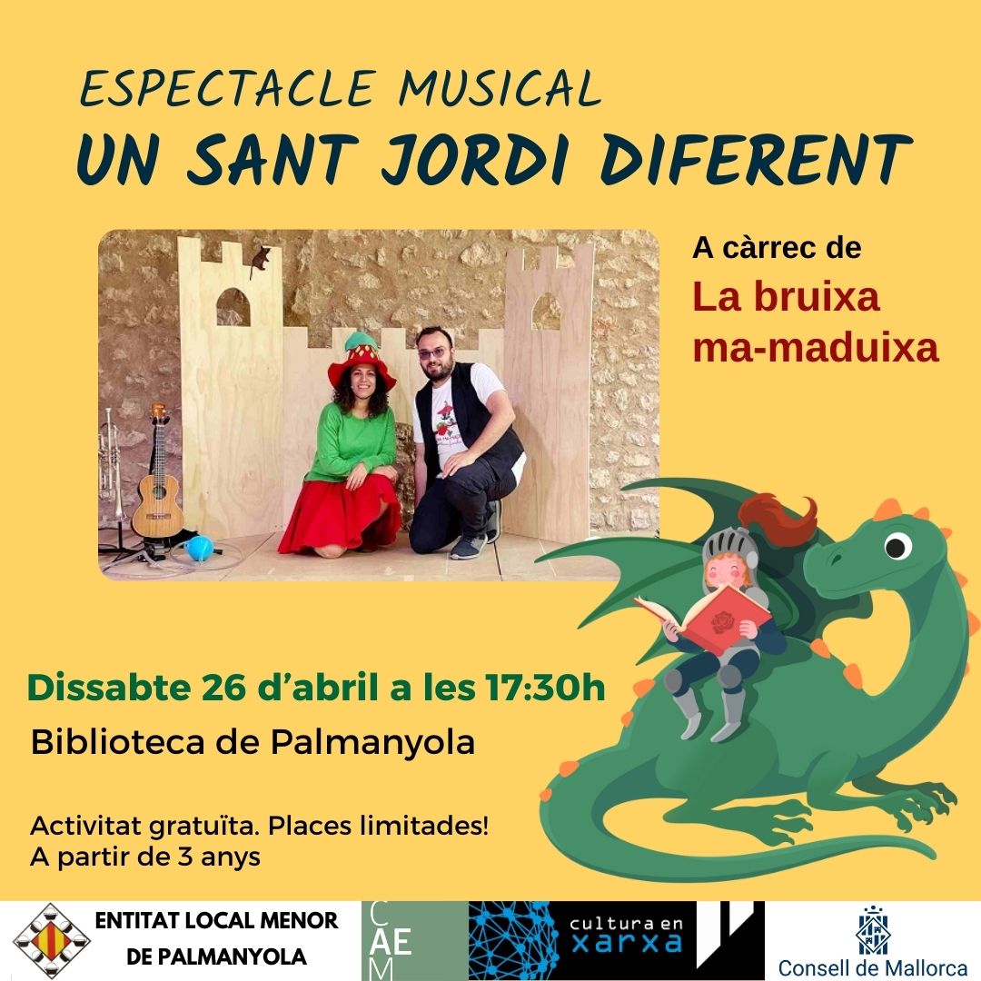 Et convidam a l’espectacle musical "Un Sant Jordi diferent", a càrrec de La bruixa Ma-Maduixa, una proposta divertida i participativa per a infants a partir de 3 anys.