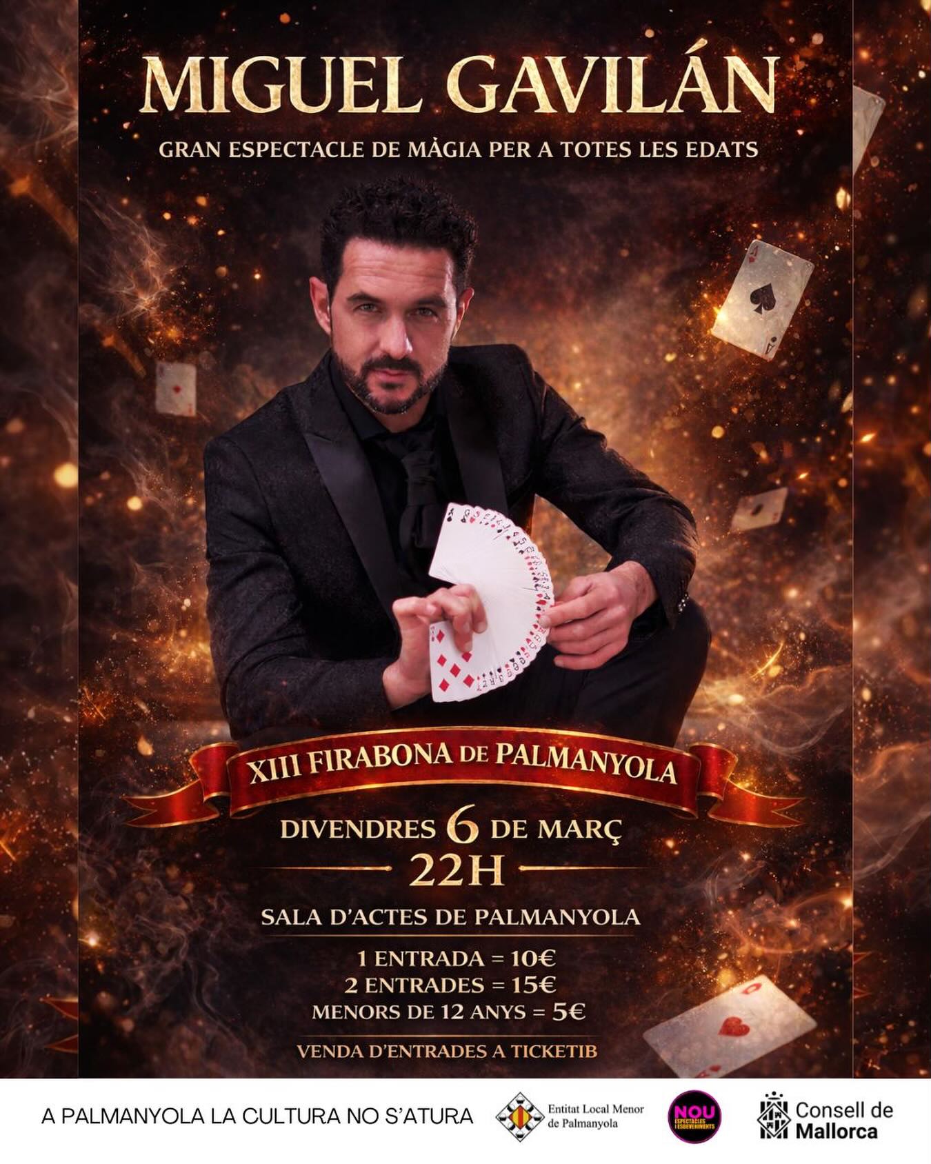 El DIVENDRES 6 DE MARÇ a les 22H, dins la XIII FIRABONA DE PALMANYOLA, arriba a la Sala d’Actes el gran MIGUEL GAVILÁN amb un GRAN ESPECTACLE DE MÀGIA I IL·LUSIONISME PER A TOTES LES EDATS.