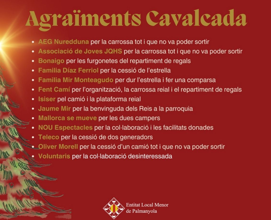 I moltes gràcies també a tots els veïnats i veïnades d'aquest gran poble que és Palmanyola, Nadal no és només una època, ni simplement unes setmanes de festes, són totes les persones que ens envolten i que estimem, és la llar a la que tornem quan necessitem refugi i quan volem sentir el calor de la família i els amics.
