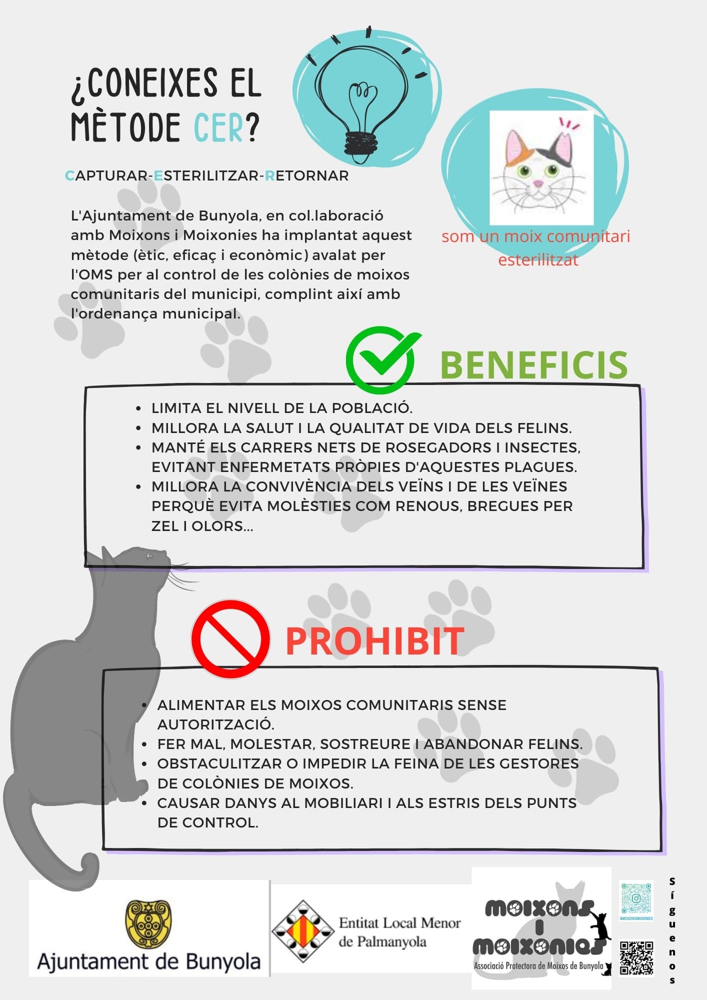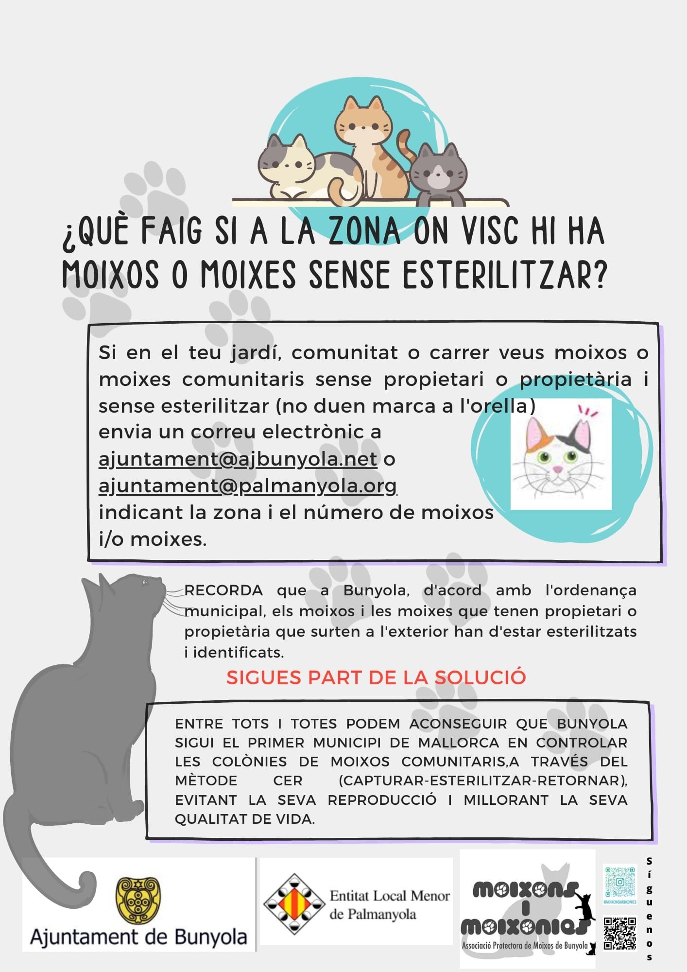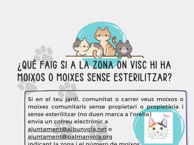 A Palmanyola, en coordinació amb l’Ajuntament de Bunyola i l’associació Moixons i Moixonies, feim feina per cuidar les colònies de moixos comunitaris de manera ètica, eficaç i responsable.